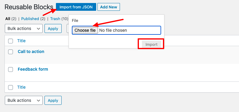 - Click on “Import from JSON”, choose your file, and then click on import. A file will be imported and here you can use that Reusable Block into another website too.