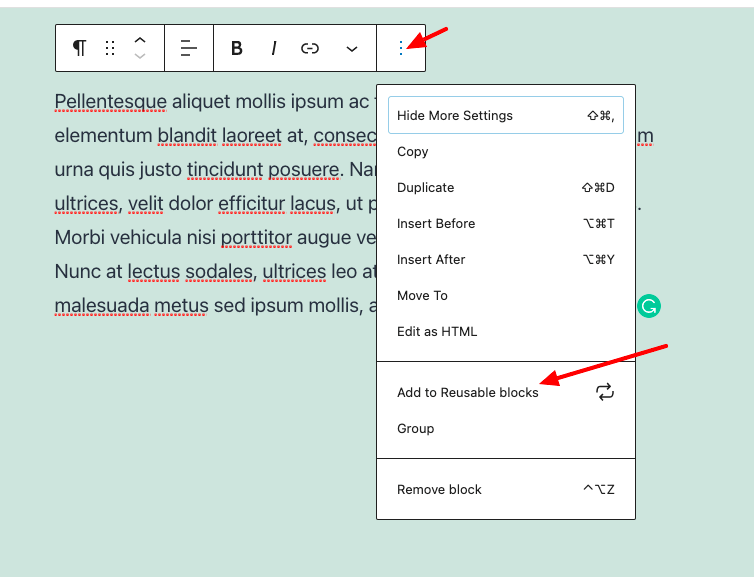 - If you want to make a set of blocks as Reusable Blocks, then select all the blocks that you want to make reusable. Now same as above, click on the three-dot menu and select the “Add to Reusable Blocks” option.