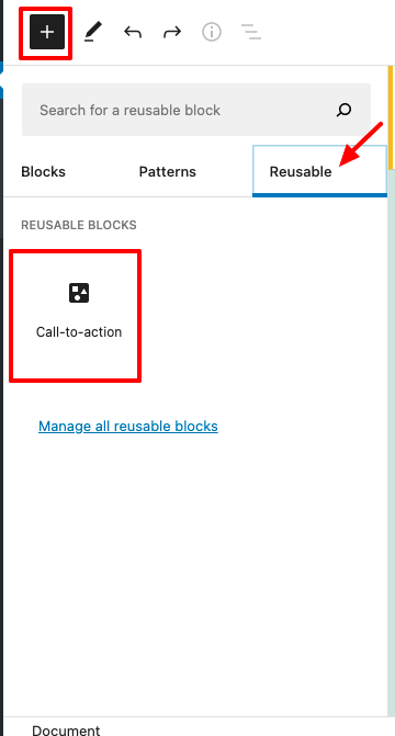 - Create another post/page where you want to insert it. Click on the plus icon in the top-left toolbar, visit the “Reusable” tab and insert a required Reusable Block here (what you have created earlier).